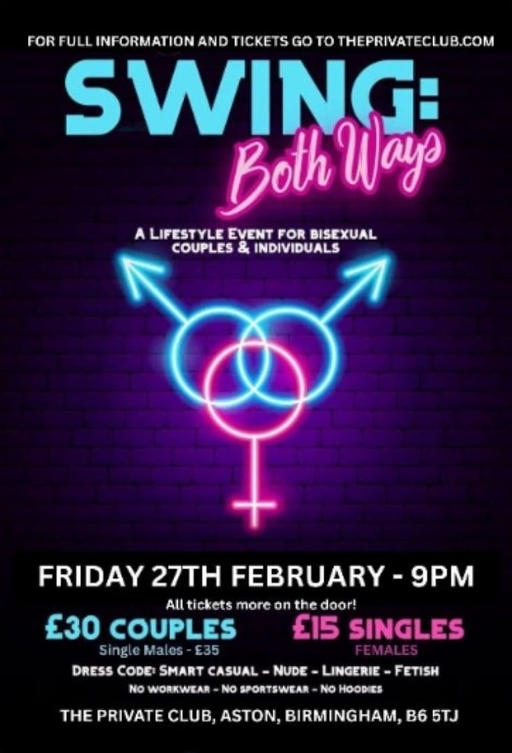 Our Extremely Popular Swing Both Ways Parties return for 2026. A lifestyle event for Bisexual Couples and Individuals